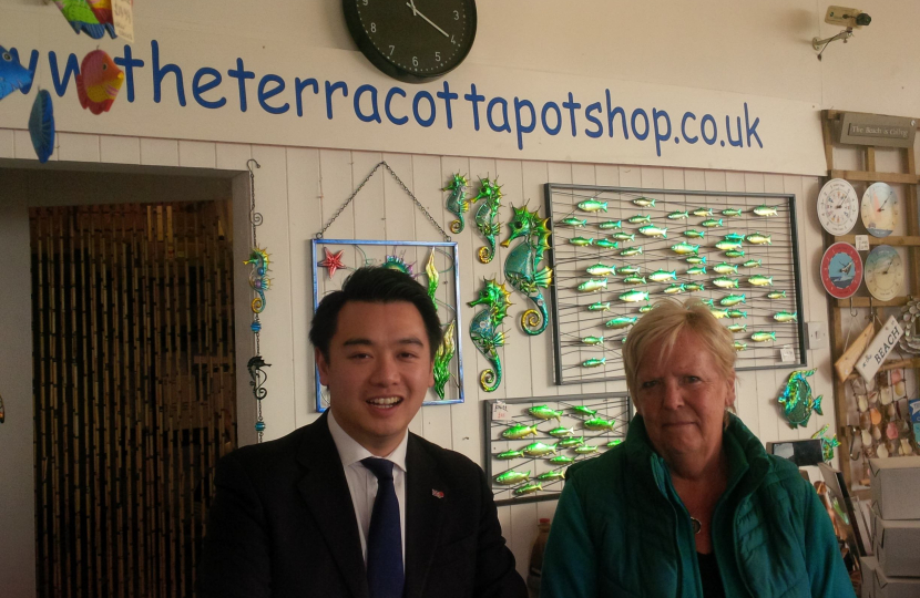 Photo: Alan Mak MP with Rosemary Satchwell, owner of Eastoke’s Terracotta Pot Shop and Chair of the South Hayling Island Coastal Community Team (CCT)