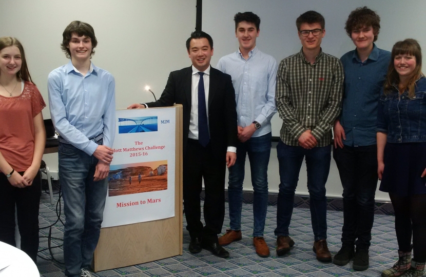 Havant MP Alan Mak has given his backing to the next generation of rocket scientists at the BlottMatthews Mission to Mars Competition at Langstone Hotel. The competition, devised by Charles Matthews and Richard Blott, and supported by the Young Engineers Charity, saw sixth form students from across Portsmouth and Havant for a £5000 prize by designing a manned mission to mars.