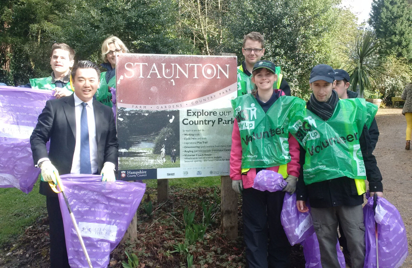 Havant MP Alan Mak donned the plastic gloves along with scores of local residents today as the Clean for the Queen campaign reached Staunton Park. As part of the nationwide drive to spruce up our cities and de-litter the land to mark Her Majesty Queen Elizabeth II’s 90th birthday, Havant Borough Council encouraged local residents to come together and clean up Staunton Park.