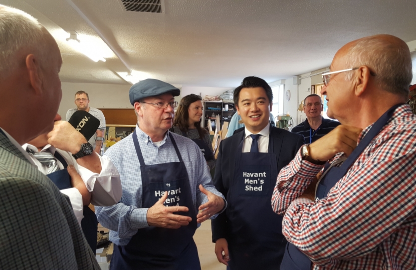 Alan Mak MP welcomed Alistair Burt to Havant on Thursday 9 June 2016 as the Minister of State for Social Care and Mental Health visited the popular Havant Men’s Shed. Mak accompanied Burt as they were given a tour of the Fraser Road workspace, where local residents gather to share skills, socialise, and take part in worthwhile community projects.